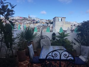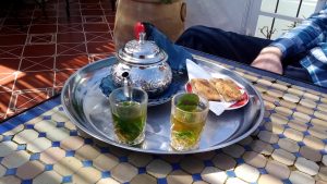 Said led us through the maze of winding streets (more like passages) of the medina to the beautiful traditional house which was our B&B. He booked us into our small but perfectly formed en suite room and we were then treated to a refreshing mint tea on the roof terrace. Here we could admire the view across the higgledy piggeldy rooftops to the neighbouring mosque and beyond where we could look back and marvel at the coast of Spain. Truly amazing to finally be in Africa!