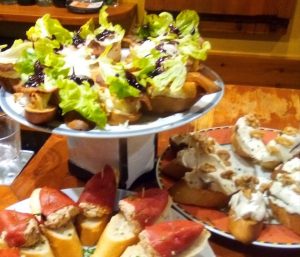 San Sebastian and the Basque Country in general, have a different tapas tradition. Here the small bites are known as pintxos (pinchos) and refer to small rounds of bread with elaborate toppings, pierced with a cocktail stick, or similar.