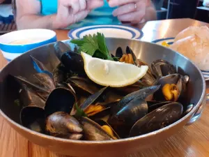 The only place I have eaten where the name of the farm who have supplied the potatoes is on the menu – that’s how seriously they take their spuds! It is unfussy, with homely blue and white crockery, excellent local bread and it serves the freshest fish and seafood, according to what’s in season. I went for mussels and a beautiful piece of lightly battered hake with alioli. Very good indeed. (Well done, the Pauls!).